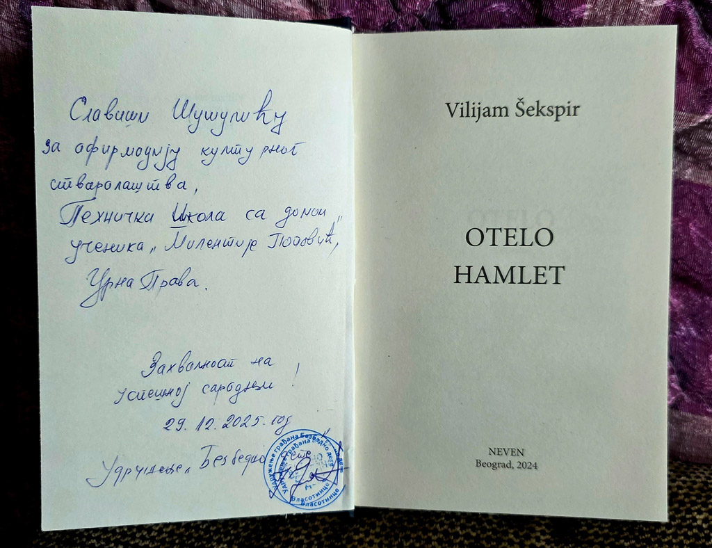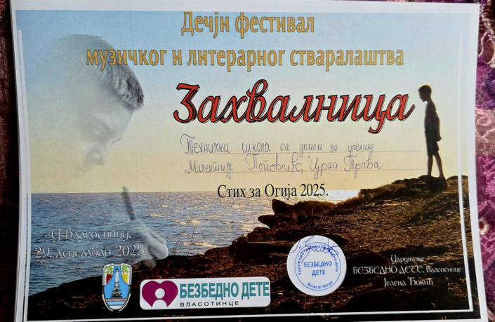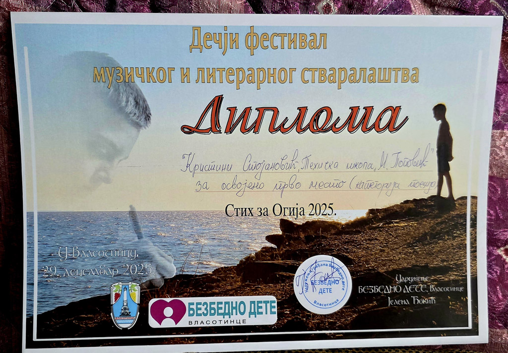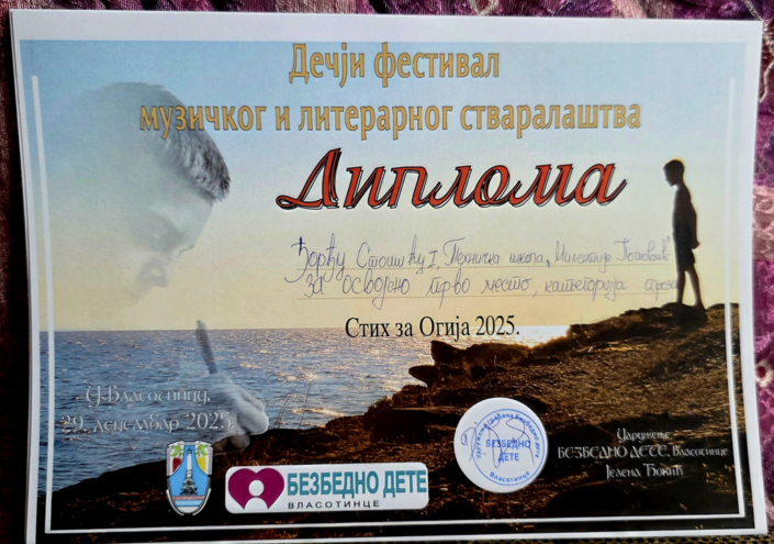 29.12.2025. године – Два изузетно значајна дечја фестивала „Стих за Огија“ и „Анђеоски глас“ одржана су 29.12.2025. године. Литерарни конкурс ,,Стих за Огија“ обележио је девету годину постојања и расписан је за ученике од првог до четвртог разреда, ученике од петог до осмог разреда основних школа и за средњошколце. Пристигла су чак 463 рада. У категорији средњошколаца у области прозе првонаграђени су власотиначки гимназијалци, али и ученик четвртог разреда наше школе Ђорђе Стошић, освојивши прво место у области прозе, као и Кристина Стојановић, такође ученица четвртог разреда, у области поезије. Удружење ,,Безбедно дете“ уручило је захвалнице менторима, професорима српског језика и књижевности који су препознали таленат својих ђака и охрабрили их да стварају сопствена дела. Посебно признање додељено је нашој школи, а захвалницу је примио Славиша Шушулић, в. д. директора школе, професор српског језика и књижевности и педагошки саветник.